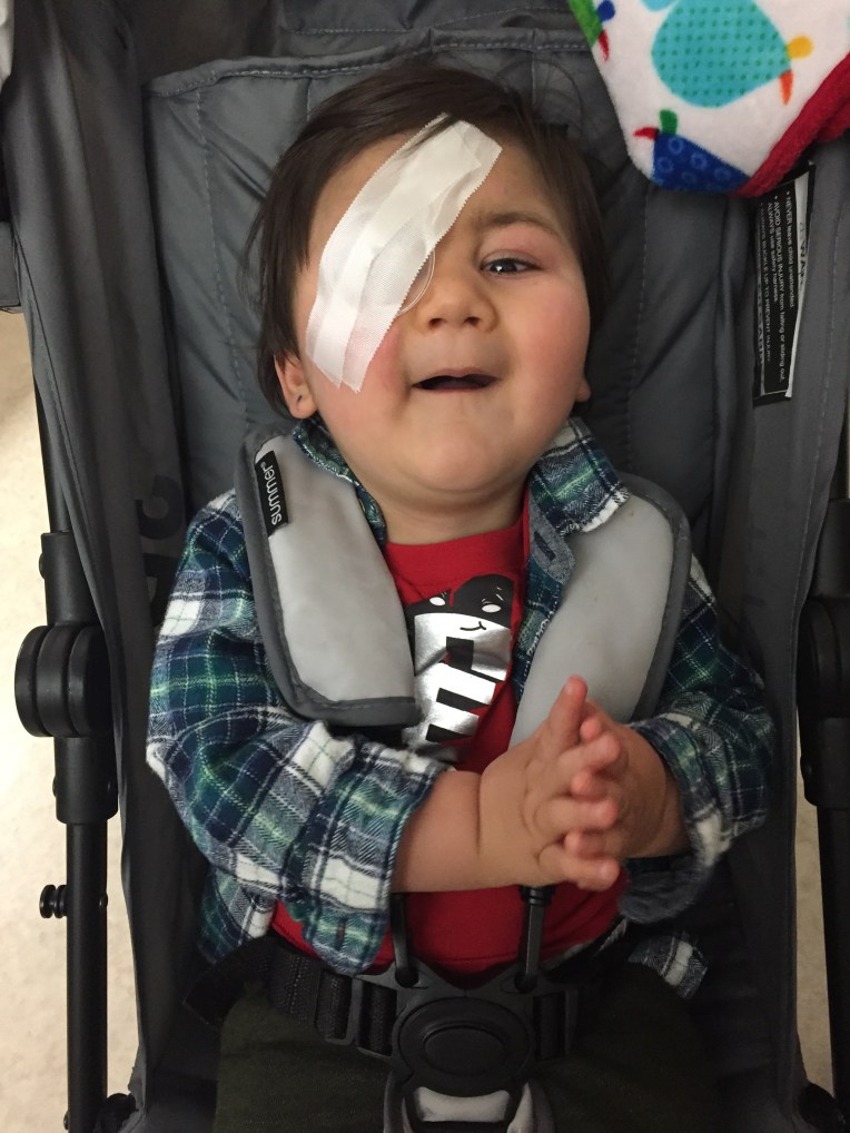 We have to try to keep Kiran from messing with his eye for about a week post-op. He is currently wearing an eye shield. We were sent home with the arm brace deals to hold his arms still if need be – we are thinking last resort on that. We also have a strict eye drop regimen for at least the next week.